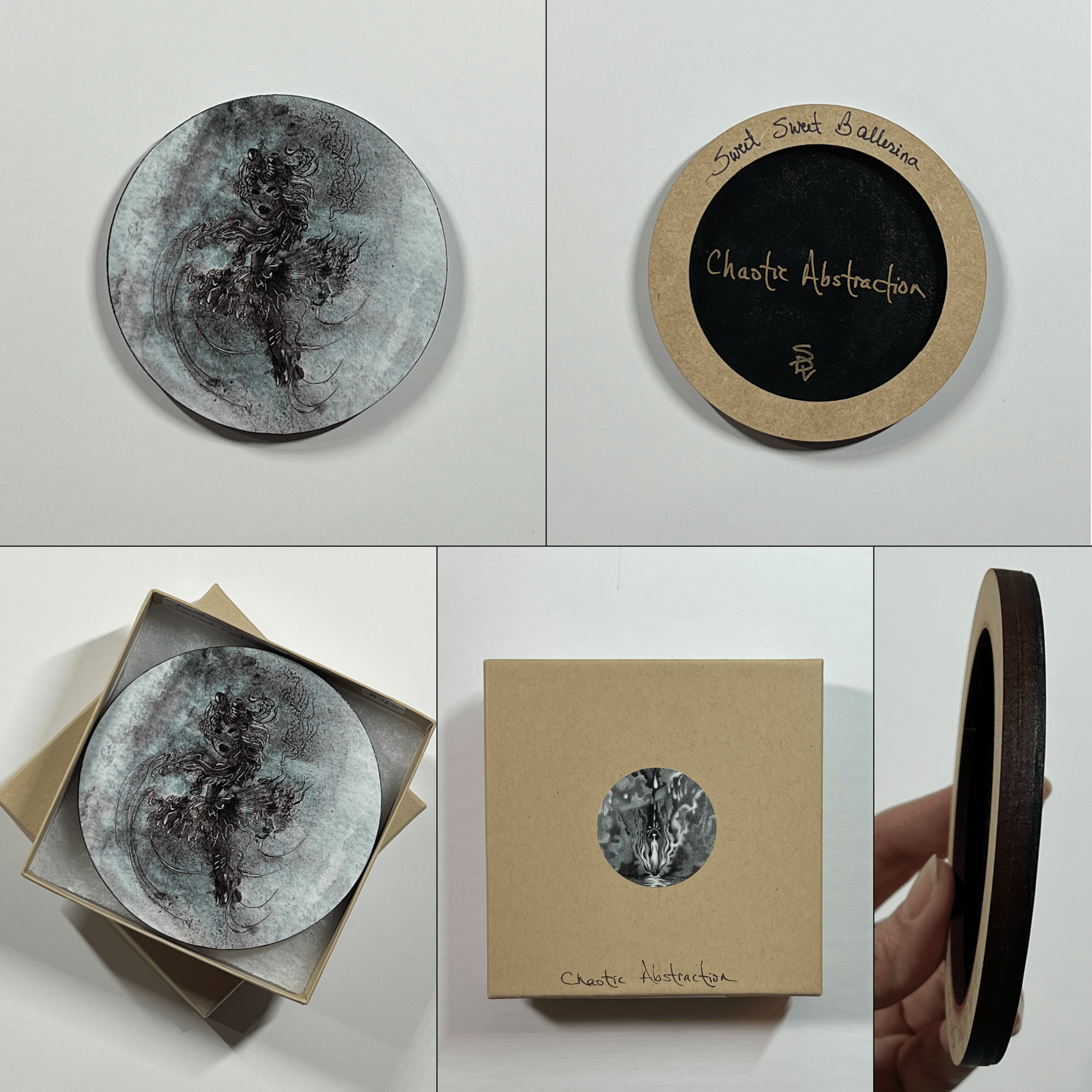 Artwork is printed on archival photo paper and sealed with high gloss varnished. The print is mounted on a 4 inches laser-cut Medium Density Fiberboard backing. This is mounted on a system of rings to create a notch on the back for hanging, if desired. Completely sealed, the artwork can be handled as well as displayed.